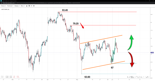 The upside leg from the low of $67 came in in five waves, forming an impulse which may or may not see further continuation toward $79.20 and $83.40 per barrel after completing some corrective pattern near $70. In the event of a breakdown, WTI's slide under the swing support of $67 would imply a flag pattern ending by $75 per barrel, exposing the commodity to a fresh multiyear low below $63.60, focusing on $60 per barrel.
