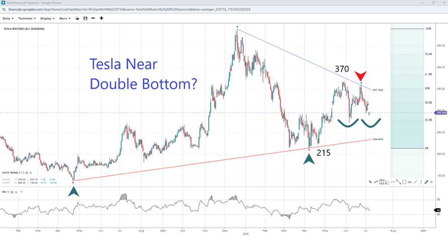 After failing to break through the $350 trendline resistance in late June, which coincides with the 50% Fibonacci, Tesla may be heading towards a double-bottom support at $270. As the long-term price action suggests a tightening consolidation, the opposing ‘autotrend’ trendline could offer support near $250 (currently at $235). However,  a break above the $300 level and the ‘autotrend’ trendline could open the door to $370 and the $400 handle, while further declines may expose $215 and $200.