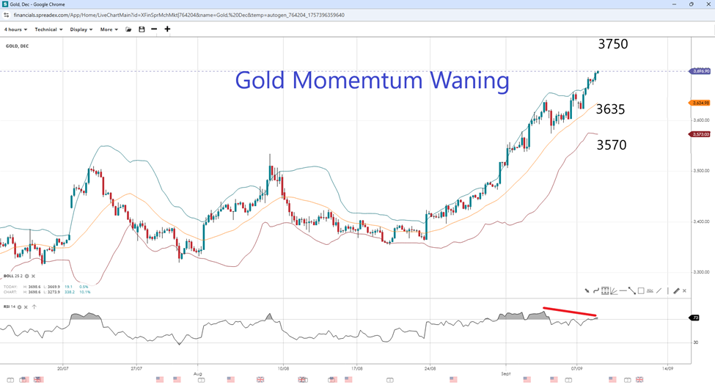 Gold prices have been on a tear since the third week of August, when Fed Chair Jerome Powell opened the door to a potential rate cut in September during his speech at Jackson Hole. The yellow metal has broken several key barriers, and the RSI has now re-entered overbought territory in the 4H chart, signalling a divergence. If markets move into profit-taking after the latest bump higher, then a return to the $3660 and $3635 (the middle Bollinger Band) per ounce support level is possible. A breakdown could head to the lower BB at $3570. On the other hand, if CPI data increases the chances of further monetary policy easing this year, then gold could break past the psychologically important $3700 level and head towards $3750.