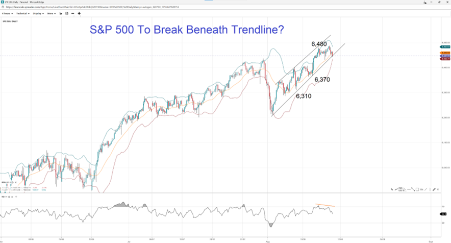 The benchmark US stock index has been trending higher through a channel since the start of the month, buoyed by generally solid earnings. However, Friday's pullback left it at the bottom of the channel, which coincides with the lower Bollinger Band near 6400. With the RSI just above 50, it suggests a potential breakdown, opening the door to 6370, which is followed by last week’s low of 6310. If the channel holds, a retest of the all-time high at 6,480 could ensue, with a higher move bringing into focus 6500.