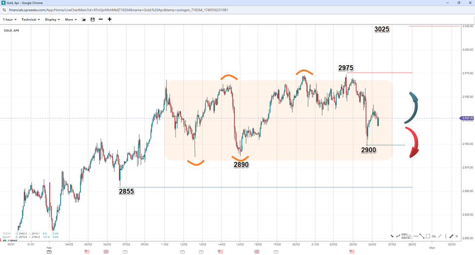 While markets remain concerned over the strength of the US economy and the potential impact of tariffs, traders will closely watch the upcoming PCE data and GDP figures on Friday and Thursday for their implications on monetary policy and, by extension, gold prices. The formation of a rectangle top pattern on gold suggests a rebound in the face of economic headwinds, though how it pans out will depend on whether support holds firm in the case of a deeper pullback.