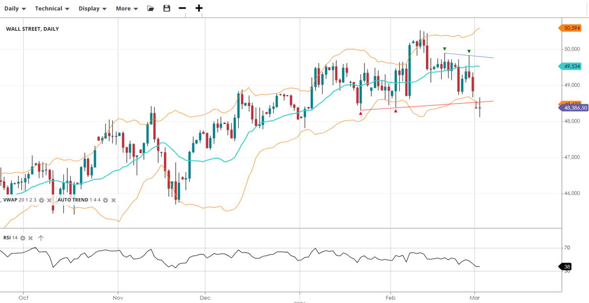 Wall Street has entered a correction phase, trading below its short-term VWAP despite the broader bullish trend. Momentum has cooled significantly, with indicators suggesting the index is searching for a floor near the lower boundary of its volatility bands.