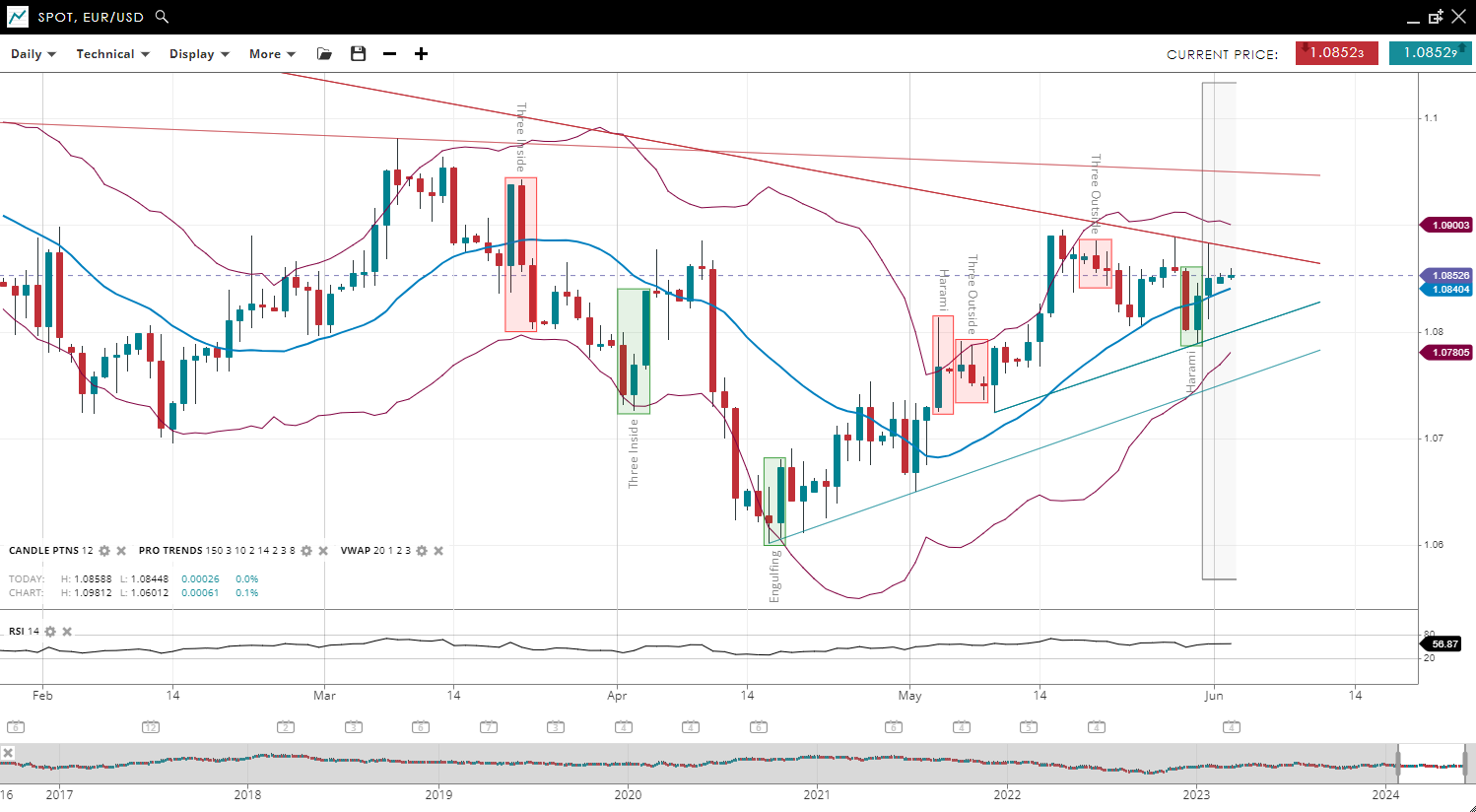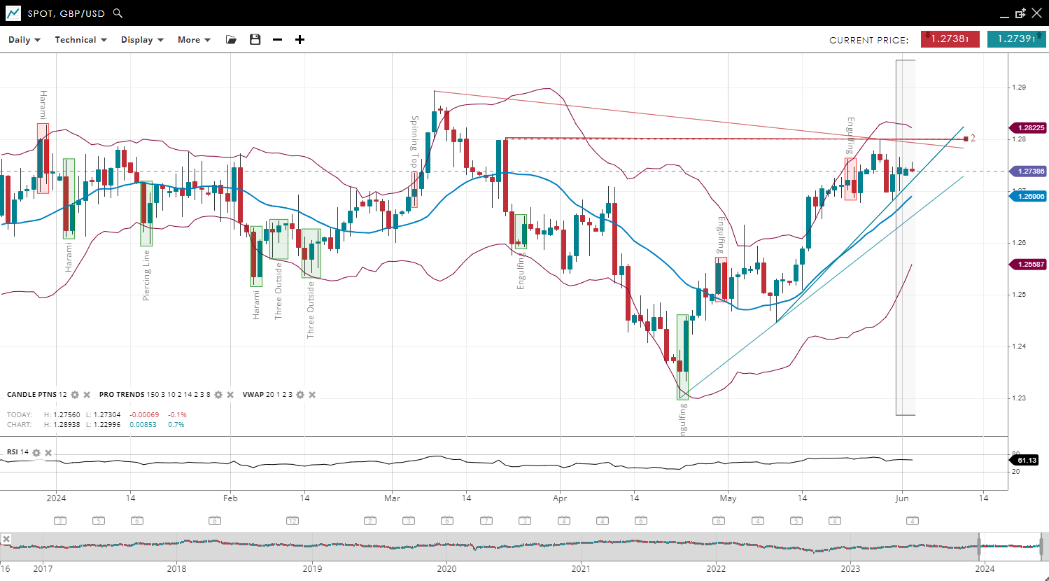 Wall Street seems to have settled into a sideways/neutral trend, with the price decreasing notably before rebounding to 38,788, below the previous VWAP of 39,247. Support and resistance levels have adjusted to 38,058 and 40,435, respectively. The RSI has decreased slightly to 46, signalling a reduction in bullish momentum compared to the previous report. Concerns over U.S. debt ceiling negotiations have weighed on the market.