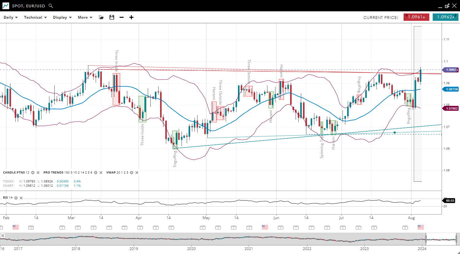 EUR/USD remains in a bullish trend and has entered an impulsive phase, with the price increasing to 1.0962, now above the VWAP of 1.0872. Support has adjusted lower to 1.0785, while resistance has increased to 1.0962. The RSI has increased significantly to 65, indicating strong bullish momentum.