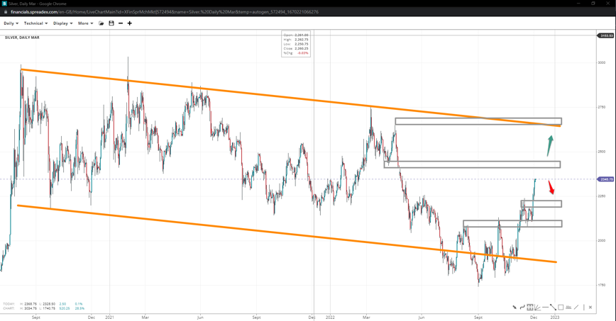 Silver might as well be trading within a descending channel, with a leg past 24.00 exposing 26.50 and the falling trendline top. Falling short before reaching resistance or reversing after it does, opens the door to 22.50 and the support at 21.00.