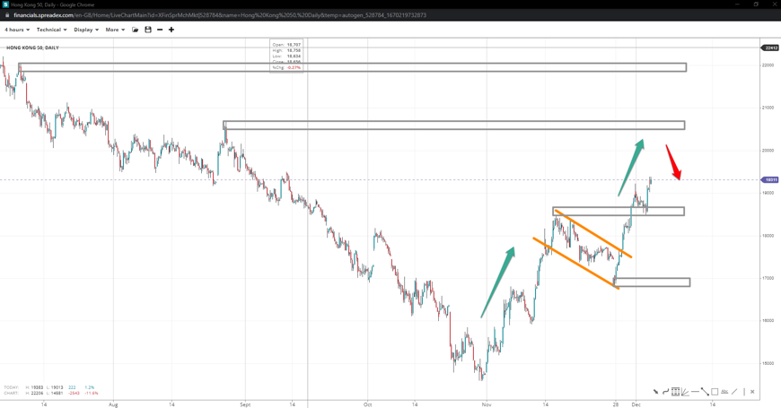 The HK 50 index soared above its rising flag pattern completed at the 17000 handle, with the peak at 18400 being short-term support. Increasing momentum brings 20700 and 22000 on the bulls’ radar unless the 20k handle changes the course of prices.