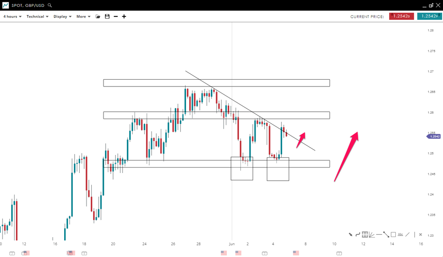 Cable posted a double bottom formation near a strong support level (1.2475 mark) which led to a reversal and a move higher. The market is struggling to break the bearish trend line to the upside, where another failure could see the support taken out. More likely the market will continue its move upward to test the 1.2600 mark.