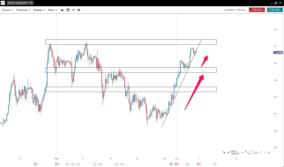 The price of USD/JPY reversed the downtrend in early June and has moved higher in a healthy uptrend which can be shown by the big bullish bodied bars and the swing highs that are distant from each other. A successful test of the strong resistance near 131.20 could see a pullback to 129.60 or potentially 128.50.