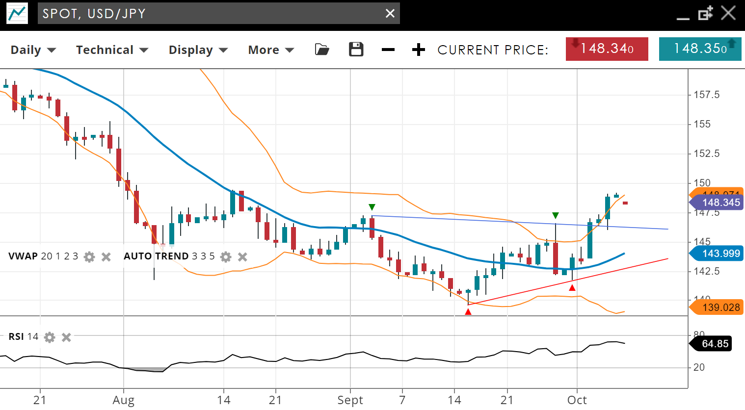 USD/JPY remains in a bearish trend but has entered a corrective phase. The price is 148.34, just above the VWAP (20) of 143.90. Support is located at 139.02, with resistance at 149.07. The RSI of 64 signals a major shift, with momentum edging towards bullish territory.