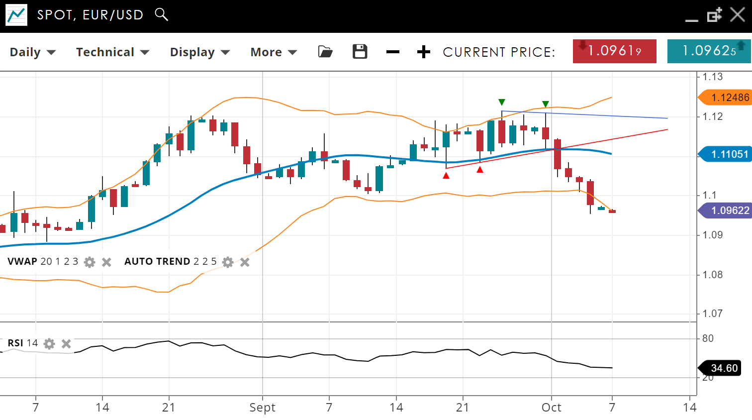 EUR/USD remains bullish but has entered a corrective phase. The current price is 1.0962, just under the VWAP (20) of 1.1105. Support is found at 1.0900, while resistance lies at 1.1248. The RSI of 34 signals weakening momentum, suggesting potential for further correction.