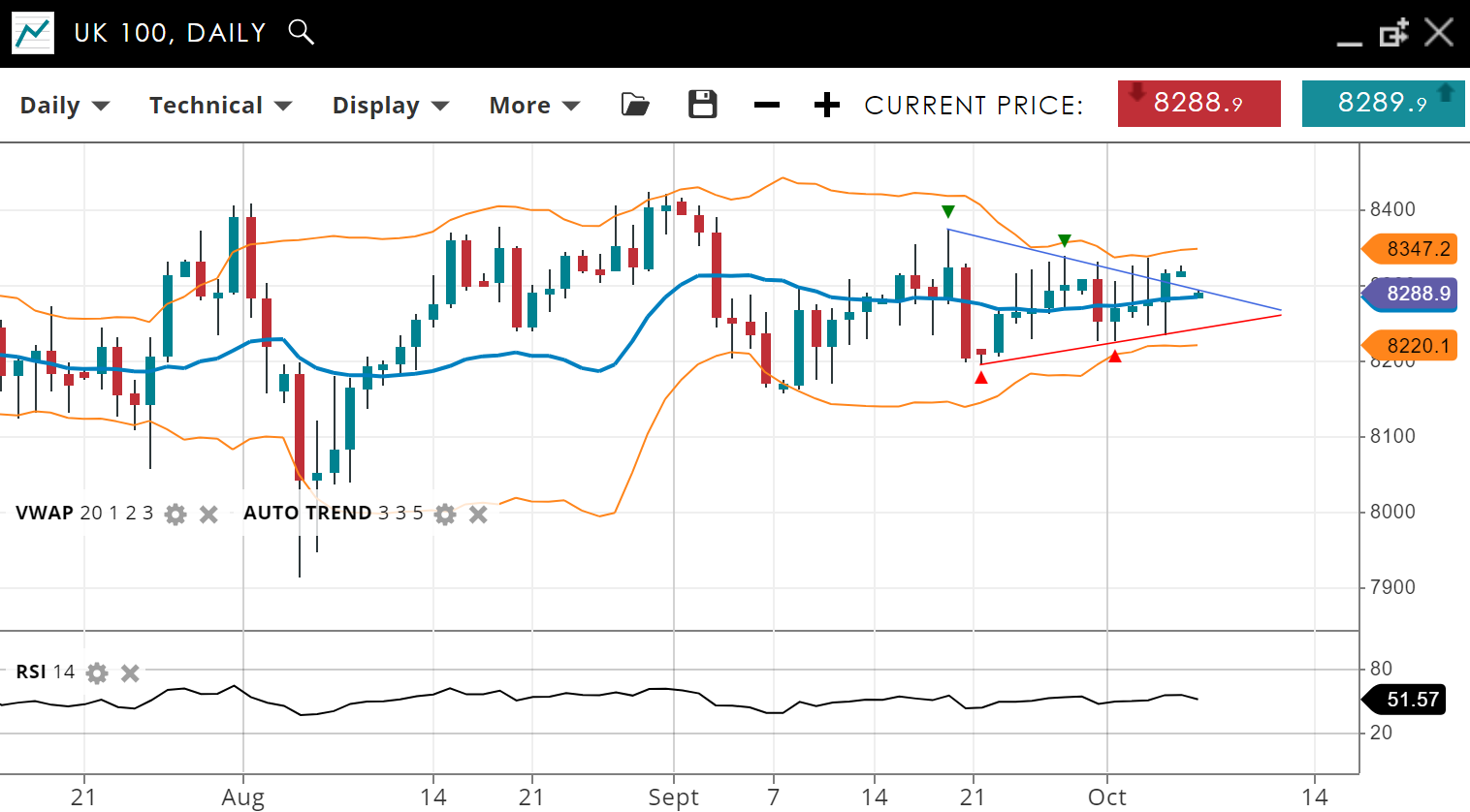 NOTE: These charts use the ‘Pro Trading Tools’ available on the SpreadEx trading platform. To use them, log in to your and click ‘Technical’ from the menu on any chart.
