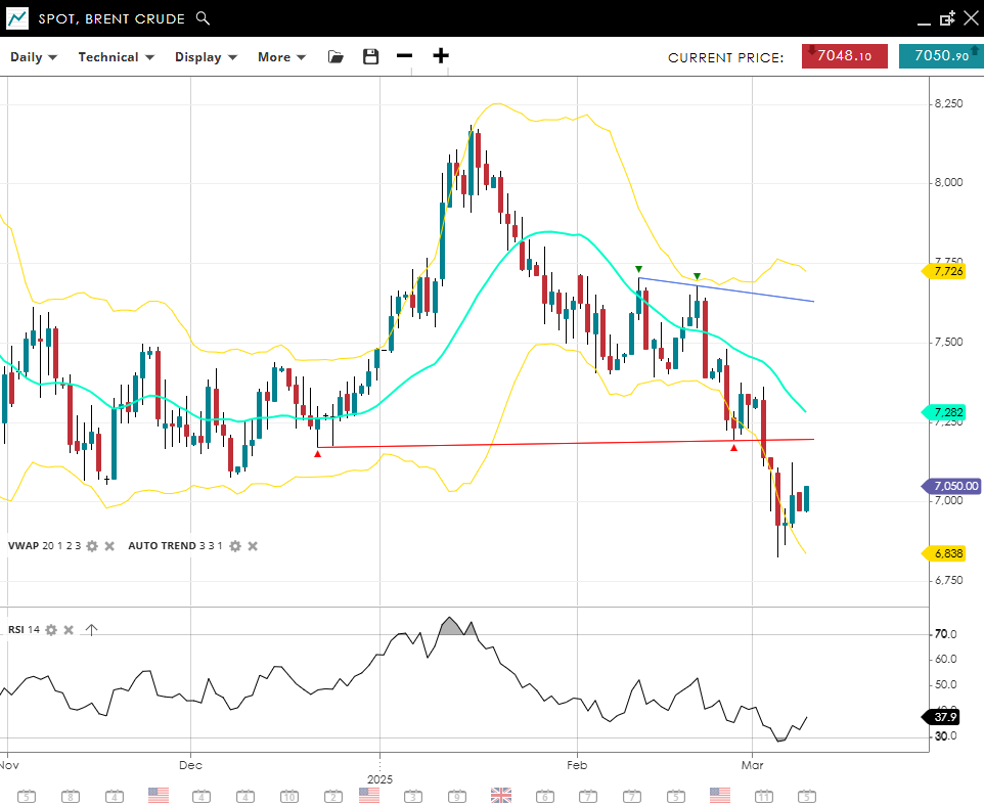Brent Crude is now in a bearish, impulsive phase, trading at 7050, well beneath its 20‐day VWAP of 7282 - testing the big 70 level. The RSI reading of 38 underscores persistent selling pressure. A break below 6838 support could accelerate the downtrend, whereas 7726 acts as resistance.