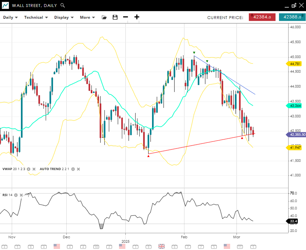 Wall Street has turned bearish, with an impulsive drop placing price at 42,385, well below the 20‐day VWAP of 43,364 and just above the 2025 low. The RSI of 33 indicates strong downside momentum, verging on oversold territory. Support aligns at 41,947, while resistance back at 44,781 marks a key barrier against further recovery.