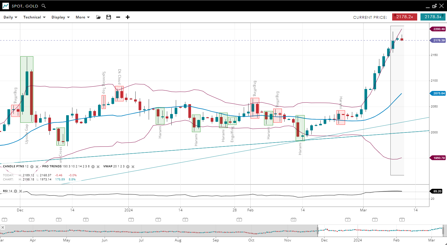 Gold is rip-roaring into a new bullish trend but with a significant increase in price to 2,178, well above the 20-period VWAP of 2,075. The support level has advanced significantly to 1,950, with resistance now at 2,200. The RSI at 85 indicates a very strong positive momentum, emphasising an increased bullish sentiment but also in overbought territory.