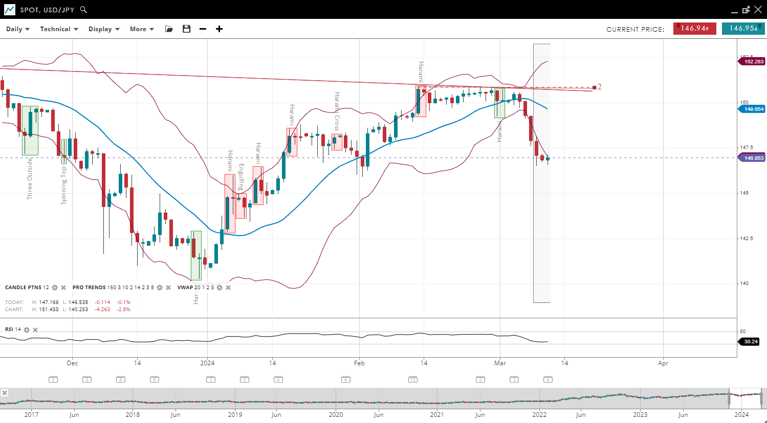 USD/JPY has abruptly begun what appears to be a new bearish trend in the impulsive phase, with its price decreasing to 146.95, below the 20-period VWAP of 149.95. The support level has sharply adjusted to 146.96, with resistance now at 152.28. The RSI is at 30, indicating a significant move to bearish momentum.