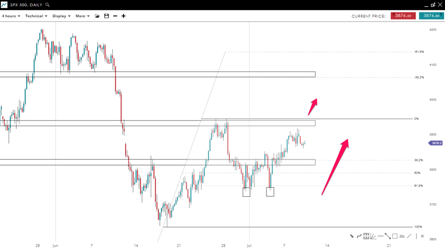 SPX500 reversed and moved higher after posting  a double bottom formation near the 61.80 % fibonacci retracement level. The market is moving to the upside with a good momentum, which could lead to a break of the 3,940 mark to the upside and then a move all the way up toward the 4,070 mark.