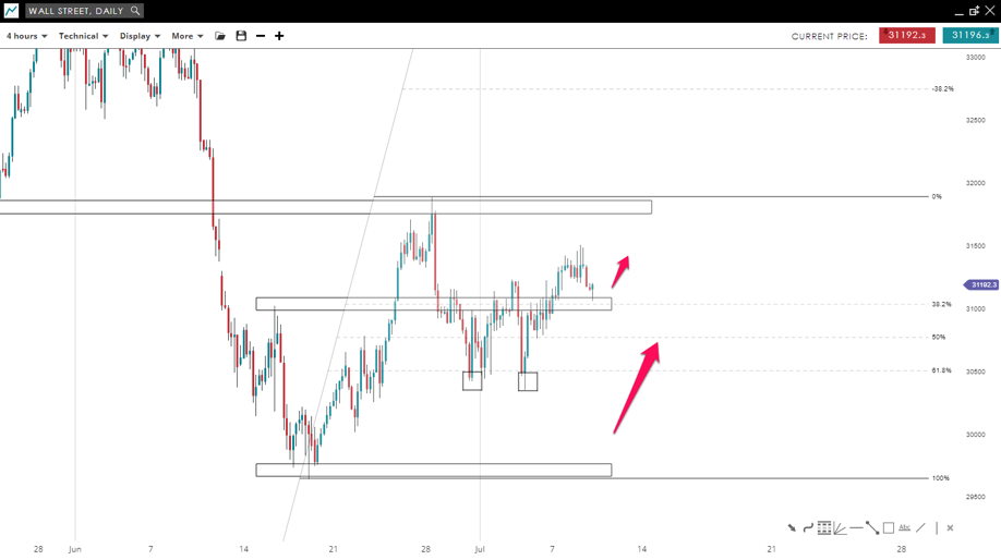 “Wall Street” posted a double bottom formation near the 61.8 % fibonacci retracement level which led to a move to the upside. The price successfully broke the pivot level around the 31,000 mark and currently the market is testing this zone as support. If support holds a new upward movement could test the 31,800 mark.
