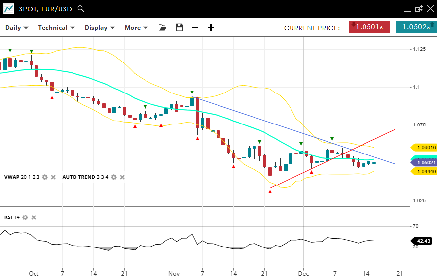EUR/USD continues in a bearish correction phase, trading at 1.0502, slightly below the VWAP (20) of 1.0520. Support is at 1.0444, and resistance is at 1.0601. The RSI at 42 indicates bearish momentum, hinting at continued downside pressure.