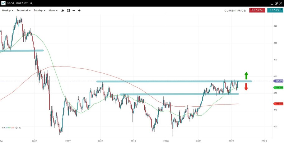 The yen is breaking down vs most major currencies. GBP/JPY sits at 4-year resistance at 157.