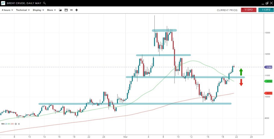 The Brent price erased its entire March rally before stabilising and rising back over the key 100 level as well as both SMAs. Another drop under 100 would likely put a pause to the long term uptrend.