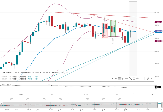 Germany 40 is displaying a neutral trend with price movements around the 20-period VWAP of 16,638. The index is supported at 16,446, with resistance at 16,811. The RSI is at 51, suggesting a balanced market dynamic.