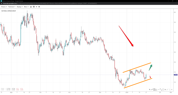 National Express has come off shy above the bottom of 125 but remains in a corrective pattern, either a flag or pennant. A short-term upside towards 150 to the upper channel could be seen in the former case. But if bulls fail to move past 140, bears could send prices back to the swing low, in a successful break below the lower channel near 133.