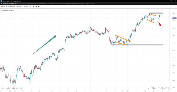 Eurostocks 50 is in a clearly defined uptrend, with the consolidation originating at  4200 forming a pennant. If the index reclaims the top, we could see the pattern come through and higher prices towards 4300. But further weakness could see a flag print instead, with the 4k handle back in the spotlight.