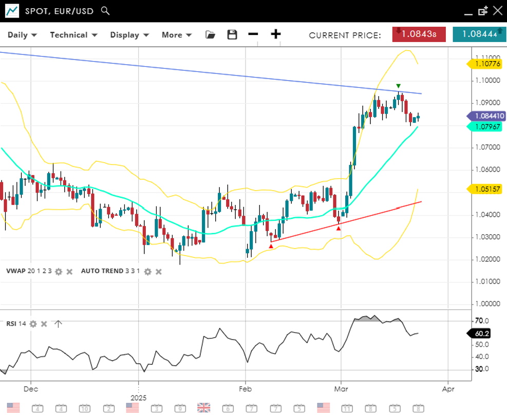 EUR/USD holds a bullish and impulsive posture, quoted at 1.0840, holding above the 20‐day VWAP of 1.0720 during a brief consolidation. The RSI at 60 leans constructive, though not overbought. 1.0515 is nearest support, while pushing through 1.1077 opens room for continued gains.