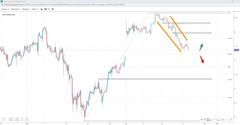 Crude oil declined below the $80.00 handle and continued to trade towards the middle of the latest uptrend, near $73.85, in what seems to be a flag pattern. If bears maintain control, we could see the index testing  $71.65. Conversely, a potential rally above 81.65 may shift the current trend.