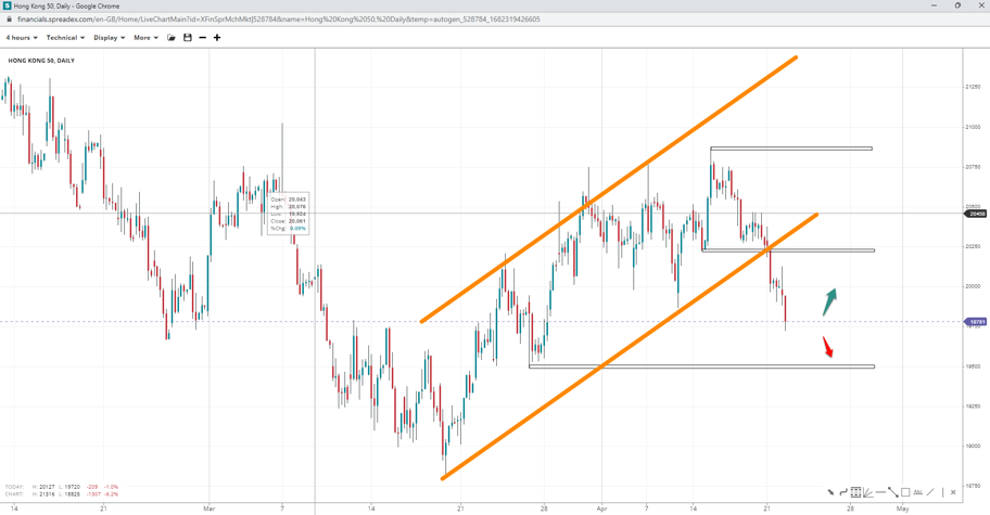Hong Kong's 50 index fell outside its ascending channel,  with key resistance and support levels at 20750 and 19500, respectively. The bulls need to propel prices above 20200 quickly or risk a potential double bottom at the swing low, while a breakdown lower could signal a decline toward 19000.