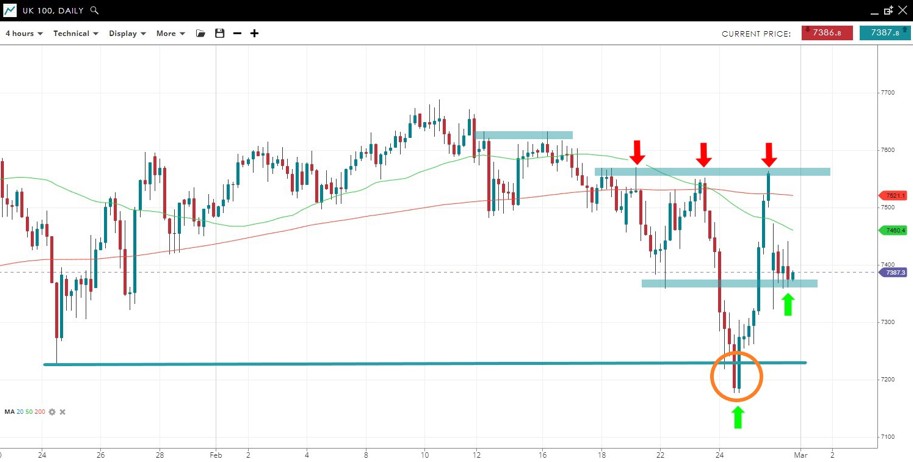Price dropped under the January low and 7200 but has since rallied right back to resistance at 7570, then gapped under 7400 and held steady.