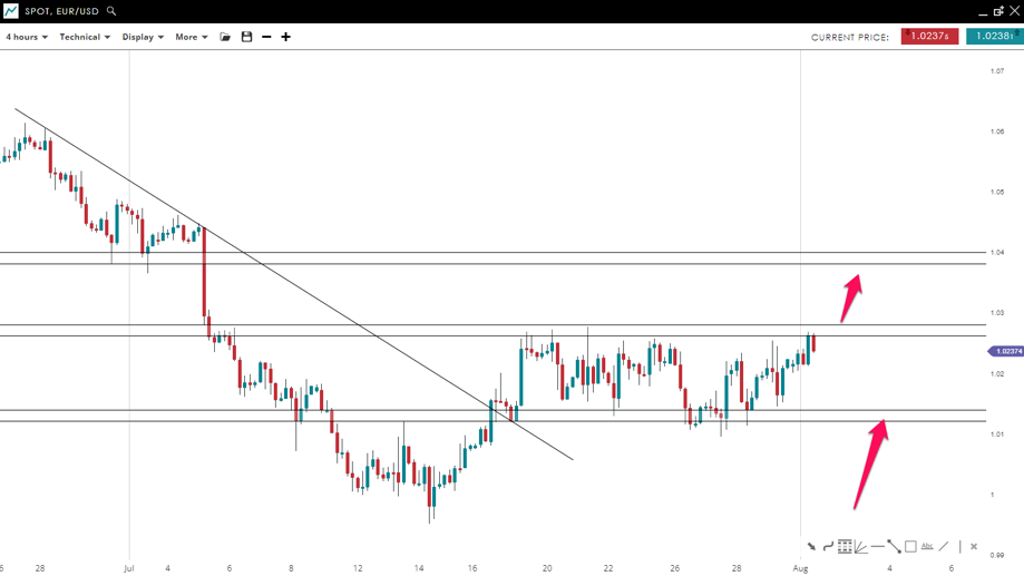 EUR/USD successfully broke the bearish trend line to the upside after finding buyers near the 0.99 mark. The price has since entered into a consolidation period where a breakout to the upside could be seen before a move upwards to test 1.04. A less likely scenario is for the EUR/USD to reverse lower again from the consolidation to test the previous support near 0.99.