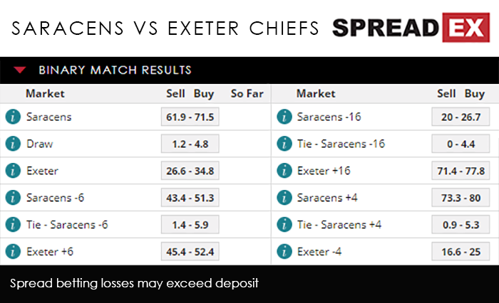 Interestingly, despite the gulf in points, this didn’t stop Saracens picking up their 4th title following a 27-10 victory at Twickenham. All of those trophies have been collected since 2010, making them easily the decade’s most successful side. Neither club encountered any trouble in the play-offs. Mark McCall’s beat Gloucester 44-19 at the Allianz Park, while the Chiefs knockout about Northampton Saints, winning 42-12 at Sandy Park. So far in 2018/19, the spoils have been shared between the Premiership’s leading lights. Back in December Exeter easily bested their rivals 31-13 at home, picking up a bonus point in the process. However, Saracens more than got their revenge at the start of May, inflicting a 38-7 loss on the Chiefs in the penultimate weekend of the season proper. That more recent victory, alongside the fact they did a number on the Chiefs in the 2018 final, just about gives the defending champions the edge, with Spreadex offering a Saracens/Exeter Points Supremacy spread of 5-8.