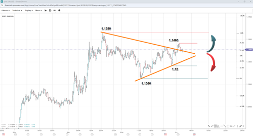 The EURUSD pair has recently surged past a potential pennant and flipped the resistance to support near 1.1370. Maintaining a bullish position outside the pattern could see prices accelerate above the regional peak of 1.1457 and towards the swing high of 1.1580, eventually exposing 1.16 and beyond. Meanwhile, the rejection at the 78.6% Fibonacci retracement of the 1.1580-1.1066 range at 1.1460 is alarming. Sliding back into the pennant’s territory might not change the current dynamics much, but losing the swing support at 1.12 might do, with interim support sitting at 1.11.