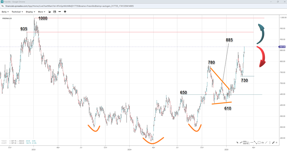 An inverse head and shoulders pattern on Fresnillo continues to point to a full-blown reversal to 1000 GBX. On the way up, resistance levels sit at 885 and 935. A pullback of the current upside leg may be imminent as prices near the short-term pennant breakout projection at 885. Losing the 780 and 730 supports may open the door to 650 and 610.