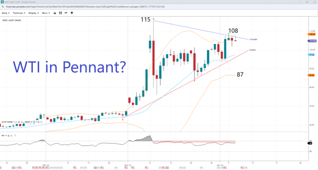 West Texan oil has found resistance at the upper trendline of a potential pennant or triangle pattern near $108/bbl, which coincides with the upper VWAP line. The short-term consolidation between the peak and $102 suggests a continuation, especially as the price remains in triple-digit territory, unless the lower end of the range gives way to bears. A continuation higher would open the door to the $115 peak of early March, while a breakdown under the middle VWAP line at $97 would expose the lower end of the indicator at $87. This would still point to a continuation, as it would increase the odds of forming a triangle pattern.