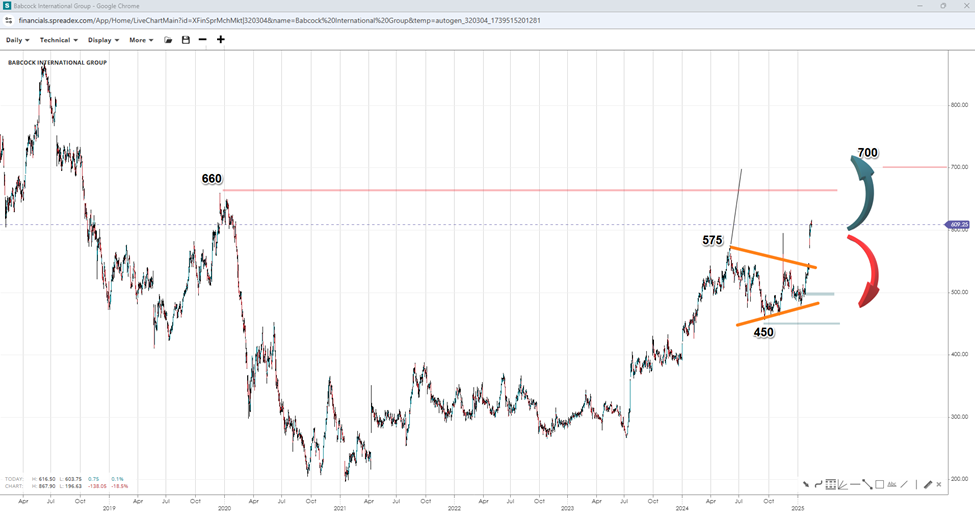 The chart pattern left behind on Babcock appears to be a pennant, which could break towards the measured-move projection of 700 GBX. The bullish continuation pattern hangs on the break of the 660 GBX peak formed in December 2019. On the flip side, sliding below the pennant's upper bound at 575 GBX could open the door to the 500 GBX round support level, exposing 450 GBX and lower regions.