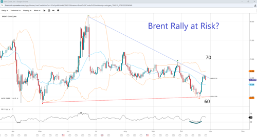 Brent prices have formed a bottom near the lower VWAP around the $60 per barrel handle, bouncing towards the upper band of $67 but meeting resistance at the descending auto-trendline connecting $81 to $69. With VWAP width relatively flat, Brent could decline back towards the $63 middle line in a pullback fashion, correct deeper near $62, or even fully reverse the recent rally given the width of the VWAP. On the other hand, a strong breakout above the trendline and the upper VWAP could open the door to $70, confirming the bullish bias shown in the RSI at the time the double bottom formed.