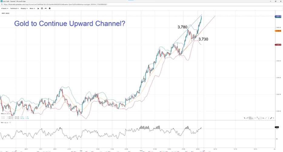 The price of gold reached a new record high on Monday, on track to have its best monthly performance in 14 years. However, this might have left the yellow metal slightly overextended, with the RSI in overbought territory above 70. It could take a breather as it approaches the psychologically important $3,900 per ounce at the top of the upward channel it has been maintaining since mid-September. A turn to the downside could find support at the prior resistance level of $3,780, which is near the middle of the Bollinger Bands. A break below could head toward the nearest swing low of $3,730.