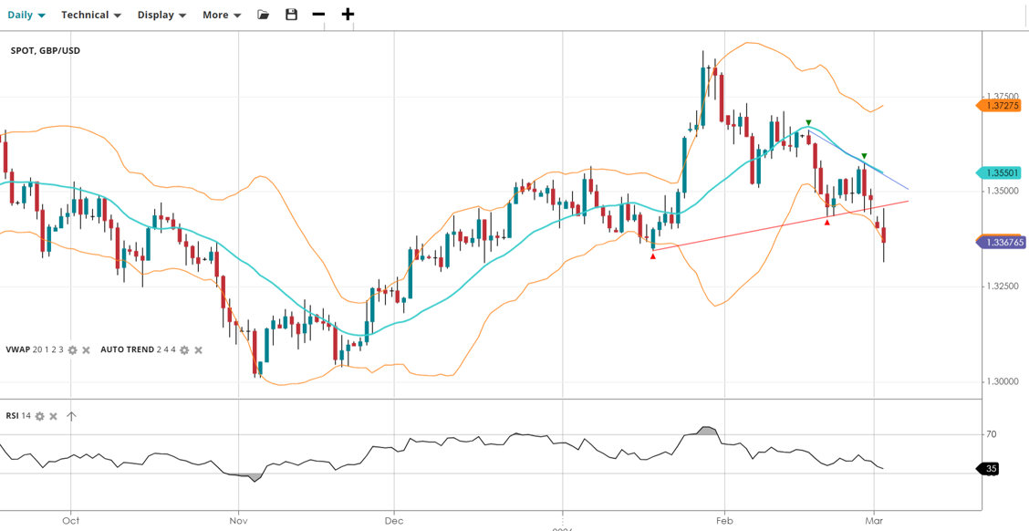 GBP/USD has shifted into a bearish trend, with price action moving impulsively to the downside. The pair is trading well below its VWAP, and momentum indicators suggest heavy selling pressure as it approaches significant support levels.