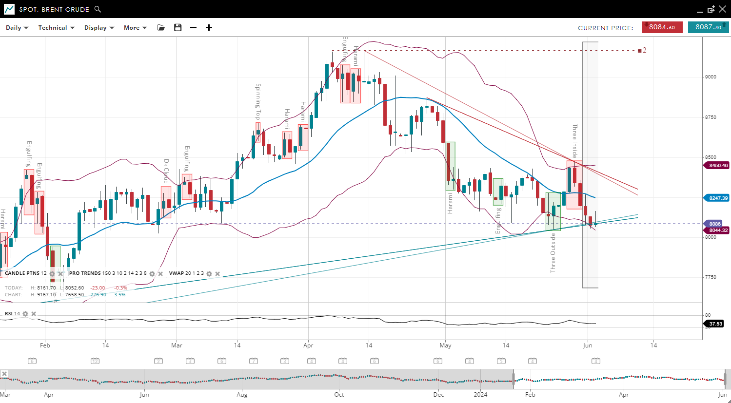 Brent Crude remains in a bearish trend and continues in an impulsive phase, with the price decreasing to 80.86, now below the previous VWAP of 82.47. Support has adjusted lower to 80.44, while resistance has increased to 84.50. The RSI has decreased to 37, indicating a strengthening of bearish sentiment compared to the previous report. OPEC's decision to maintain current production levels has affected prices.