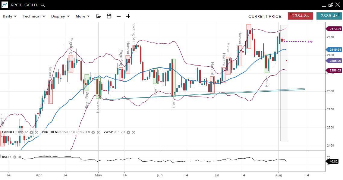 Gold looks to be transitioning into a bearish trend with a steep correction of its long-running uptrend, with the price gapping down to 2,385, below the VWAP of 2,415. Support has adjusted lower to 2,358, while resistance has increased to 2,473. The RSI has dropped to 46, indicating a switch from bullish to bearish momentum.