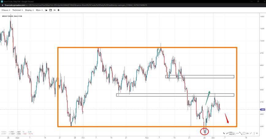 Brent fell below the 82.50 support but not far to presume a breakout, forming a double bottom following the false break. After putting in a new peak at 89.40, the pullback down to 85.00 could be an offer to extend the upward leg towards 92.50. But bulls might lose the short-term support for a chance at 80.70.