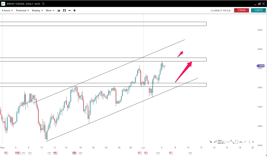 Brent Crude Oil is bouncing inside a bullish channel pattern where it is posting higher highs and lows. On Friday, the price of Brent Crude Oil took off and moved to the upside after a correction. It reached the 122 mark but failed to break it. The overall uptrend would indicate a slight correction before a new bullish impulsive wave to the upside to break the 122 level.