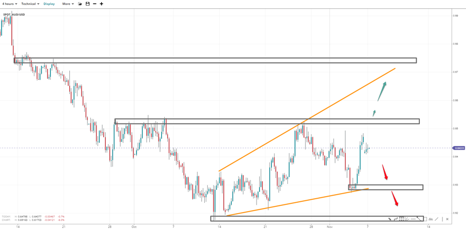 AUD/USD appears to be moving up in a broadening wedge pattern, with potential at 0.67 and above increasing. Bulls must retake the 0.6550 top and hold the 0.65 support once -and if- the latter breaks. Otherwise, a slide towards 0.63 could clear the path to 0.62 next.