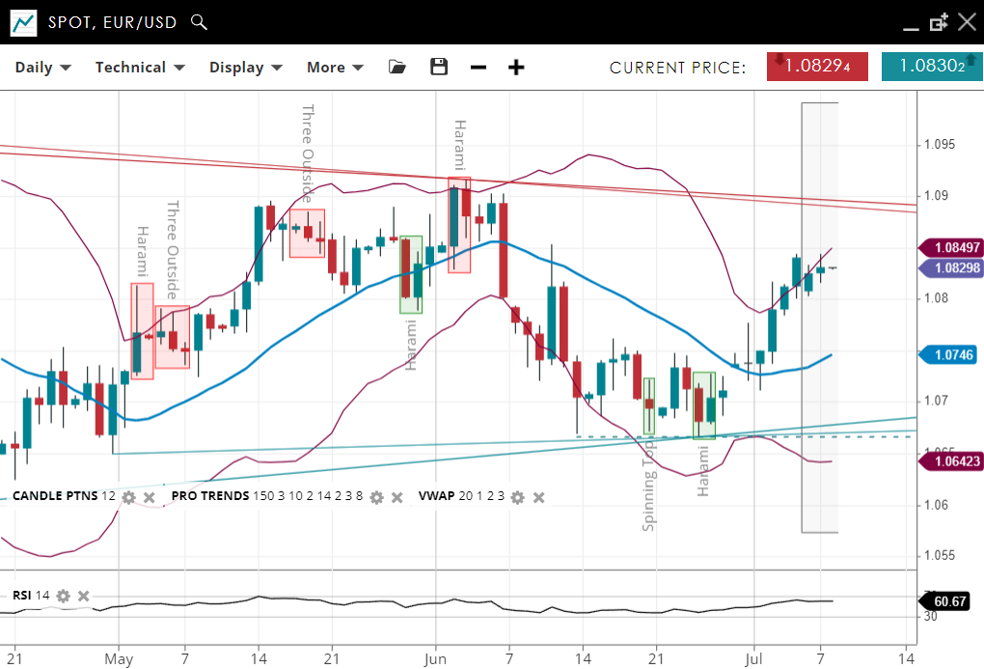 EUR/USD has broken out from its previous downtrend but the new uptrend needs to take out the June high to be sustainable. It is now well  above the VWAP of 1.0746. Support has adjusted higher to 1.06423, while resistance has increased to 1.08497. The RSI has increased to 60.67, indicating a reduction in bearish pressure.