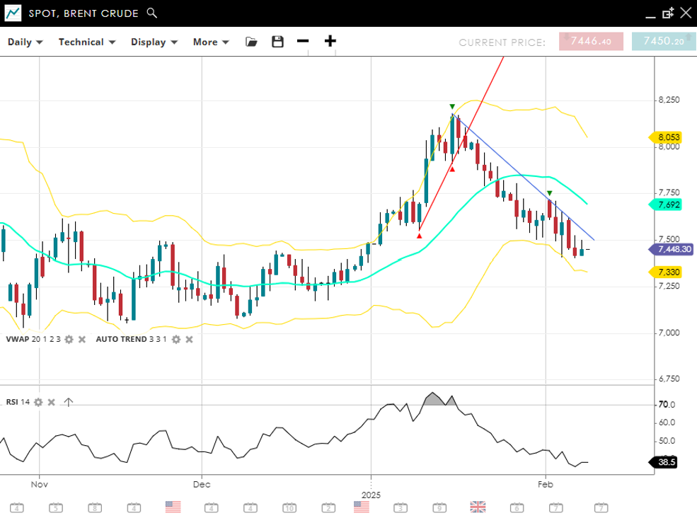Brent Crude has entered a new volatile consolidation, trading at 7,448, back below its VWAP (20) of 7,692 and under the key 75 level. Support is forming at 7,330, while resistance is overhead at 8,053. The RSI at 38 signals neutral momentum, with potential for either a breakout or further consolidation.
