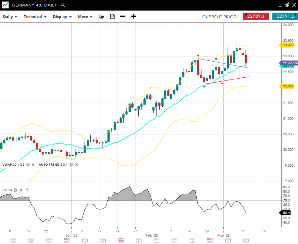 Germany 40 remains in a bullish, impulsive phase, with its price currently at 22,790, holding just above the 20‐day VWAP of 22,750. The RSI reading of 56 signals moderate momentum but is now signalling strong bearish divergence signalling an imminent trend reversal. Support is located at 22,051, while resistance stands at 23,370.