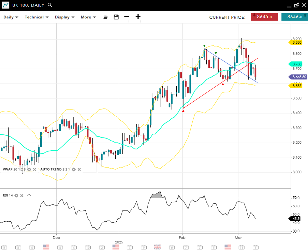 The UK 100 maintains a bullish trend but has entered a corrective phase, trading at 8,646,  below the 20‐day VWAP of 8,733. Momentum has cooled, reflected by an RSI of 46 back below the key 50 threshold. Support can be found at 8,587, while resistance sits at 8,880.