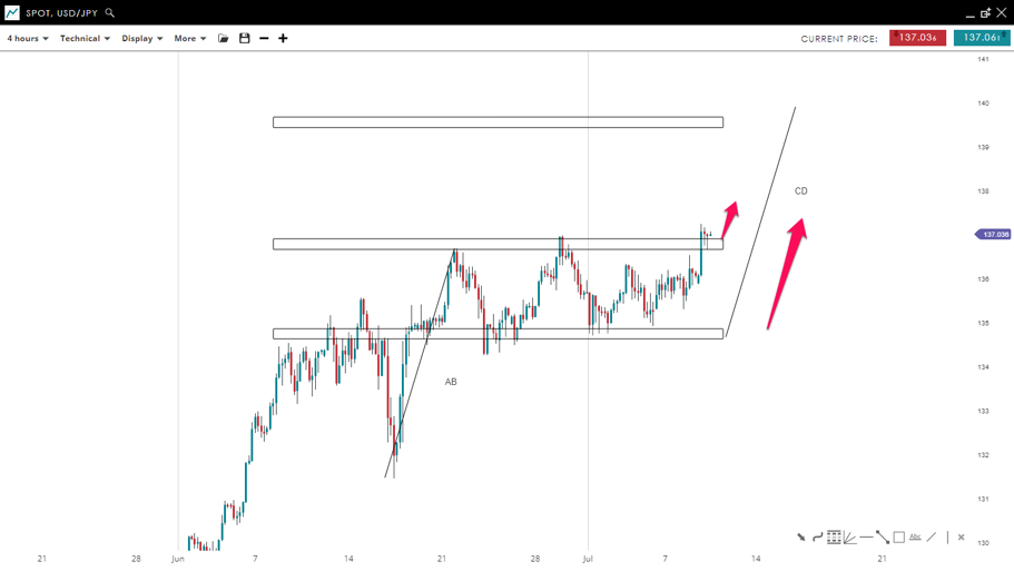 The price of “USD/JPY” successfully broke and closed above the higher end of the parallel channel formation. A big bodied bullish bar is left at the breakout showing that the buyers are about to push the price furthermore to the upside toward the 139/140 zone. This level is obtained using the ABCD pattern which says the impulsive waves should be of equal length.
